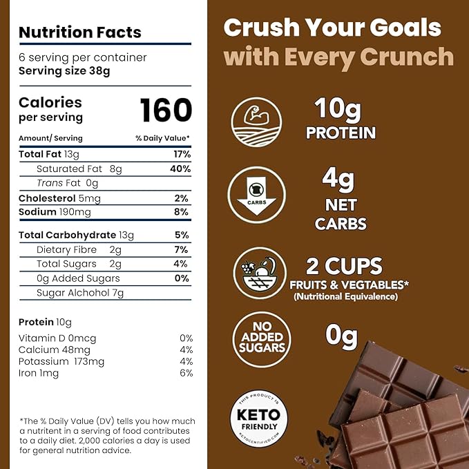 16G OF PROTEIN WITH ADDED FRUITS & VEGGIES: Our keto-friendly chocolate puffs deliver 16g of protein along with 2 servings of fruits and vegetables, such as broccoli, spinach, and carrots, making them a nutritious low-carb snack.