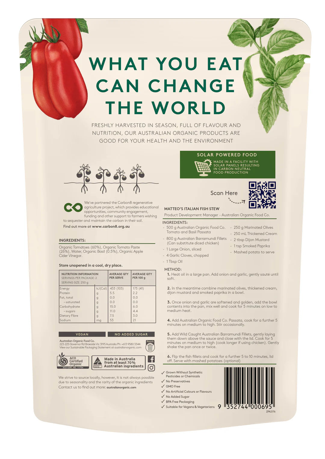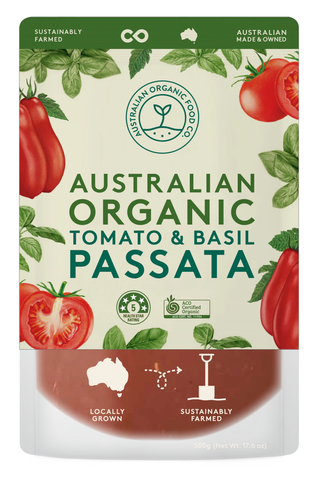 The Australian Organic Food Co Tomato & Basil Passata contains no preservatives, no added sugar and no artificial colours or flavours! We love that the ingredients are grown without synthetic pesticides or chemicals.