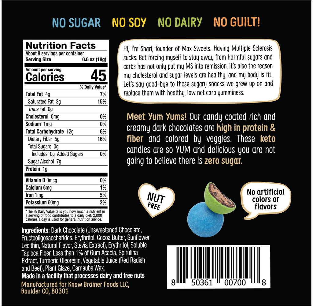 Max Sweets keto candy is ideal for dark chocolate enthusiasts. These sugar-free snacks can be enjoyed by those who are lactose intolerant, diabetic, or vegan. Our crunchy chocolate candies are soy, nut, dairy, and gluten-free. Coloured by veggies, and crafted by expert chocolatiers, Max Sweets keto foods contain no preservatives, stabilisers or artificial ingredients!Â