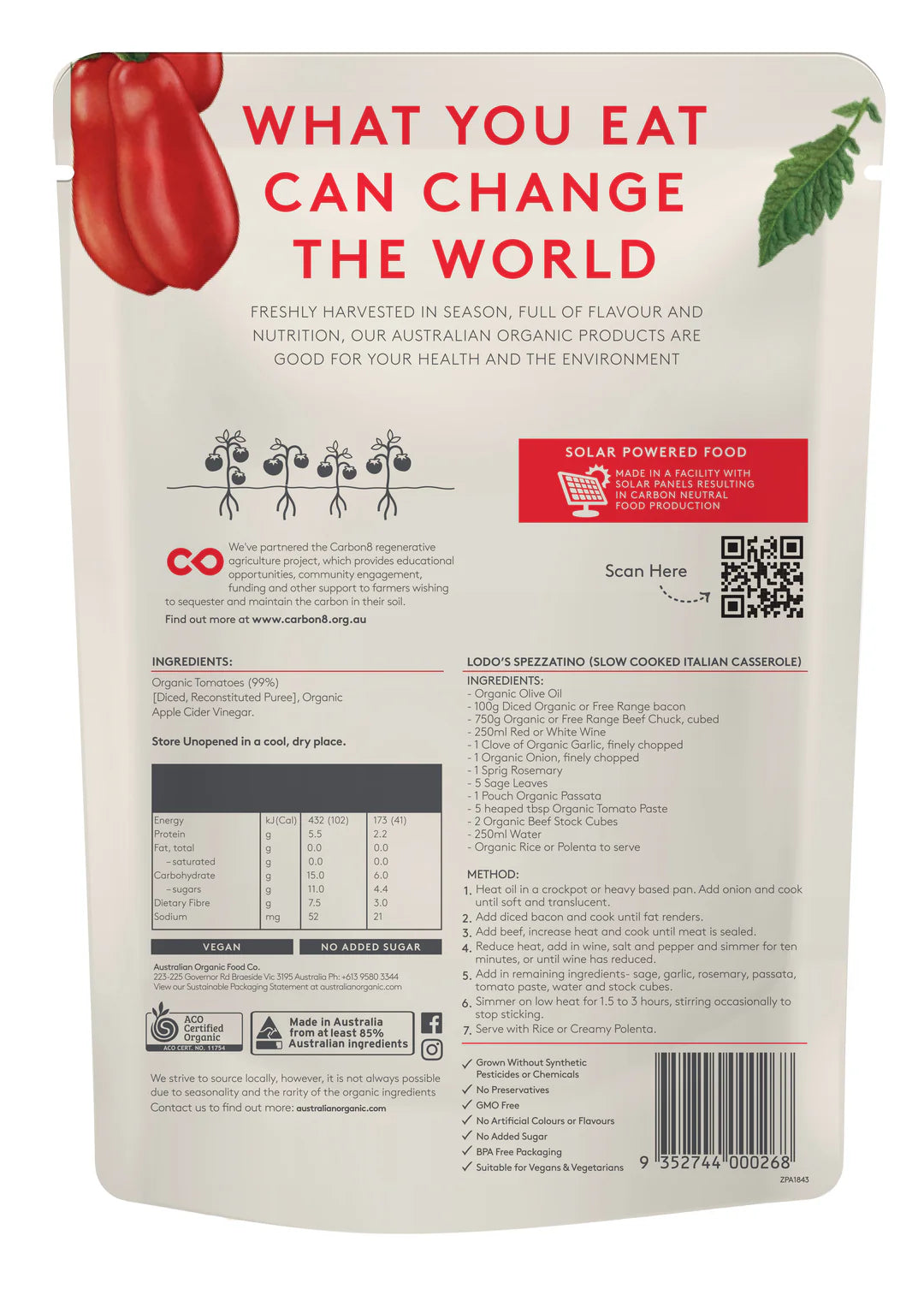 Organic Australian Tomatoes (99%) [Diced, Reconstituted Puree], Australian Organic Apple Cider Vinegar.