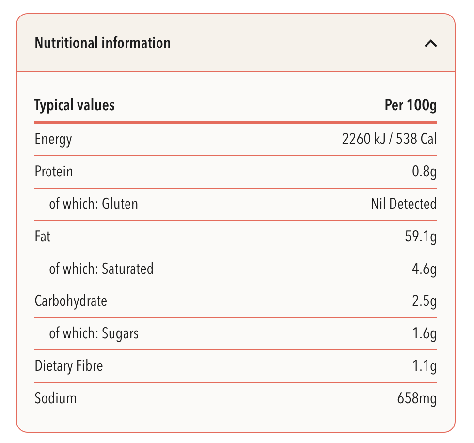 Ingredients - Vegetable Oil, Water, Vinegar, Apple & Lemon Juice Concentrates, Mustard, Pink Himalayan Salt, Citrus Fibre, Faba Bean Protein, Starch, Flaxseed Fibre, Preservatives (202,211)