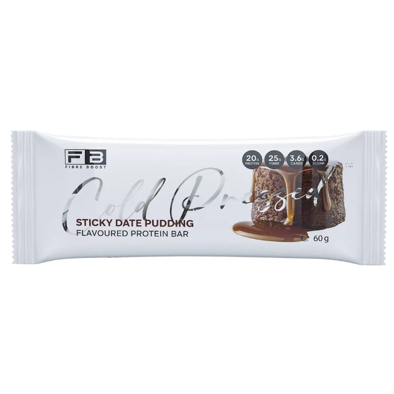 The Fibre Boost Cold Pressed Protein Bar in Sticky Date Pudding flavour is a high-protein, high-fibre, low-sugar snack that captures the taste of a rich, golden pudding swirled with sticky dates and warm butterscotch.