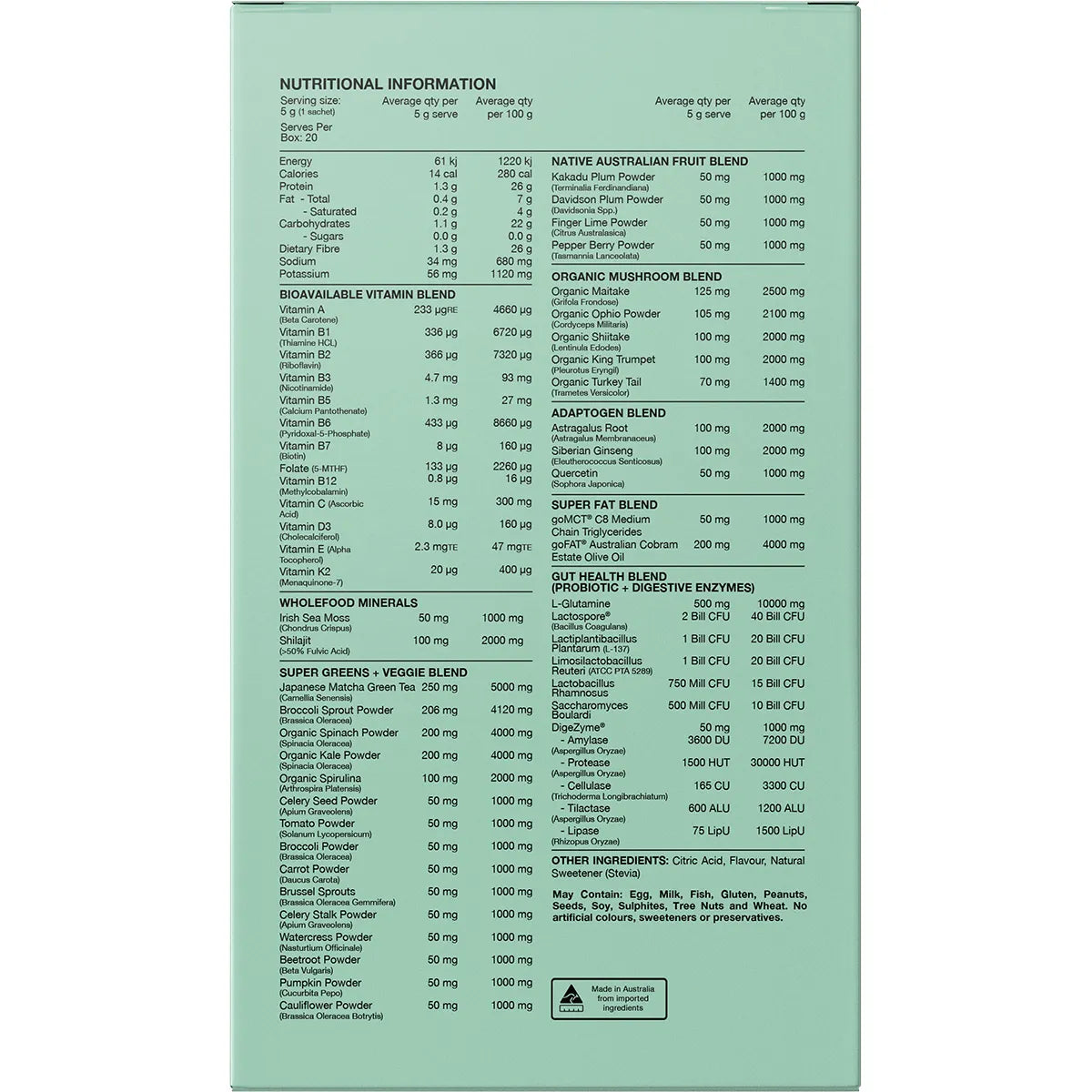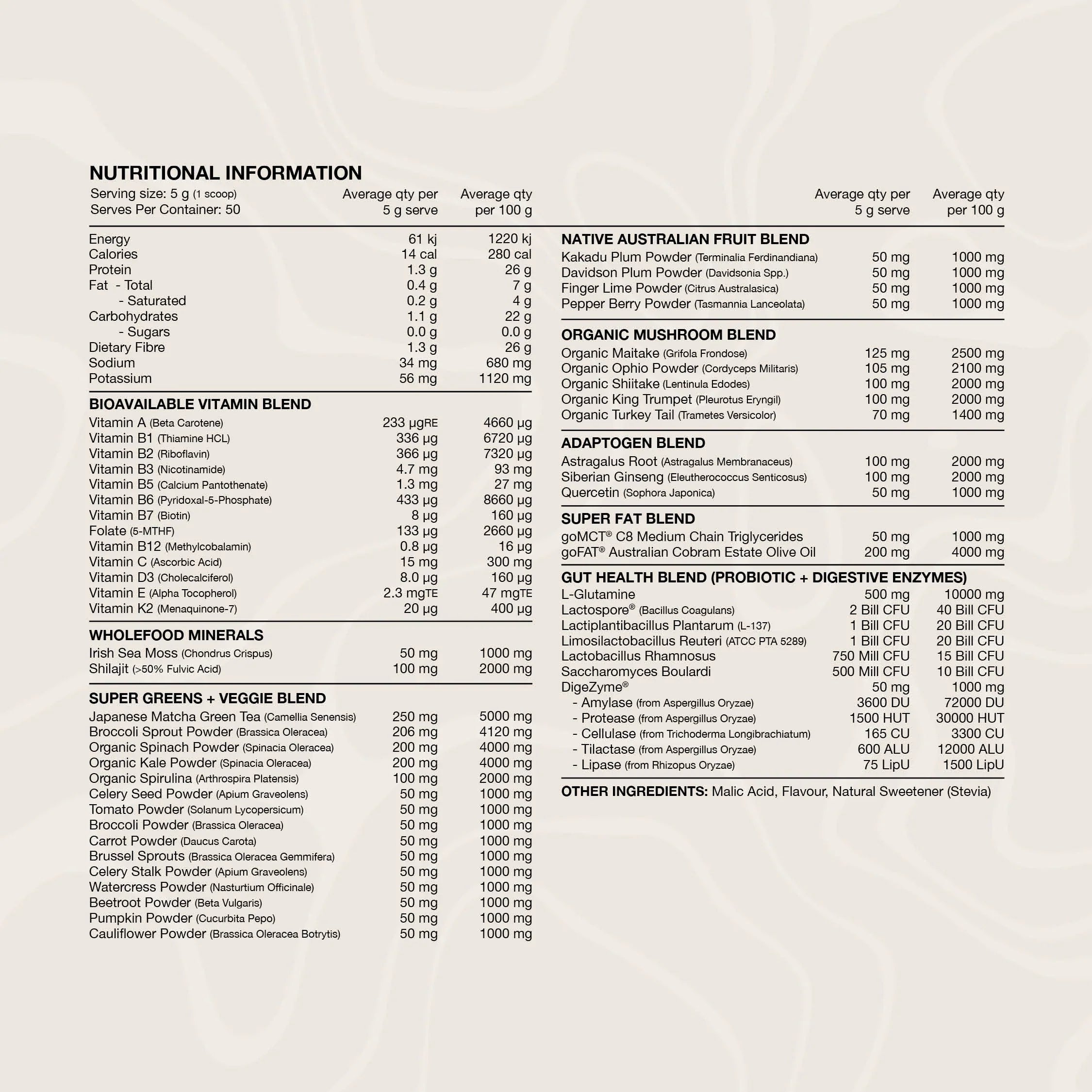 • Super Greens & Vege Blend Japanese Matcha Green Tea, Broccoli Sprout Extract, Organic Spinach Powder, Organic Kale Powder, Organic Spirulina, Celery Seed Powder, Tomato Powder, Broccoli Powder, Carrot Powder, Brussels Sprouts Powder, Celery Stalk Powder, Watercress Powder, Beetroot Powder, Pumpkin Powder, Cauliflower Powder, Organic Mushroom Blend (Organic Maitake Mushroom, Organic Cordyceps Militaris, Organic Shiitake Mushroom, Organic King Trumpet Mushroom, Organic Turkey Tail Mushroom), Gut Health Blend L-Glutamine, Digezyme® (Amylase, Protease, Cellulase, Tilactase, Lipase), Lactospore® (Bacillus Coagulans), Lactiplantibacillus Plantarum, Limosilactobacillus Reuteri, Lactobacillus Rhamnosus, Saccharomyces Boulardii), Flavour, Citric Acid, Adaptogen Blend (Astragalus Root, Siberian Ginseng, Quercetin) Super Fat Blend (Gofat® Australian Cobram Estate Olive Oil GoMTC® C8 Medium Chain Triglycerides), Native Australian Fruit Blend (Kakadu Plum Powder, Davidson Plum Powder, Finger Lime Powder, Pepper Berry Powder), Bioavailable Vitamin Blend (Vitamin C (Ascorbic Acid), Vitamin E (Dl-Alpha Tocopherol), Vitamin B3 (Niacinamide), Vitamin B5 (Pantothenic Acid), Vitamin B6 (Pyridoxal 5-Phosphate), Vitamin B2 (Riboflavin), Vitamin B1 (Thiamin), Vitamin A (Beta Carotene), Vitamin K2 (Menaquinone-7), Vitamin D3 (Cholecalciferol), Vitamin B7 (Biotin), Folate (5-Mthf), Vitamin B12 (Methyl cobalamin)), Wholefood Mineral Blend (Organic Himalayan Shilajit (=50% Fulvic Acid, Irish Sea Moss), Natural Sweetener (Stevia).